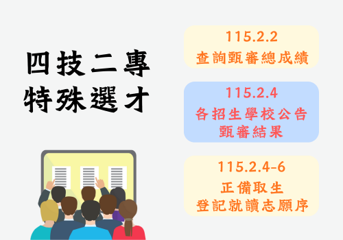 2/2查詢甄審總成績;2/4各校公告甄審結果;2/4-6登記就讀志願序