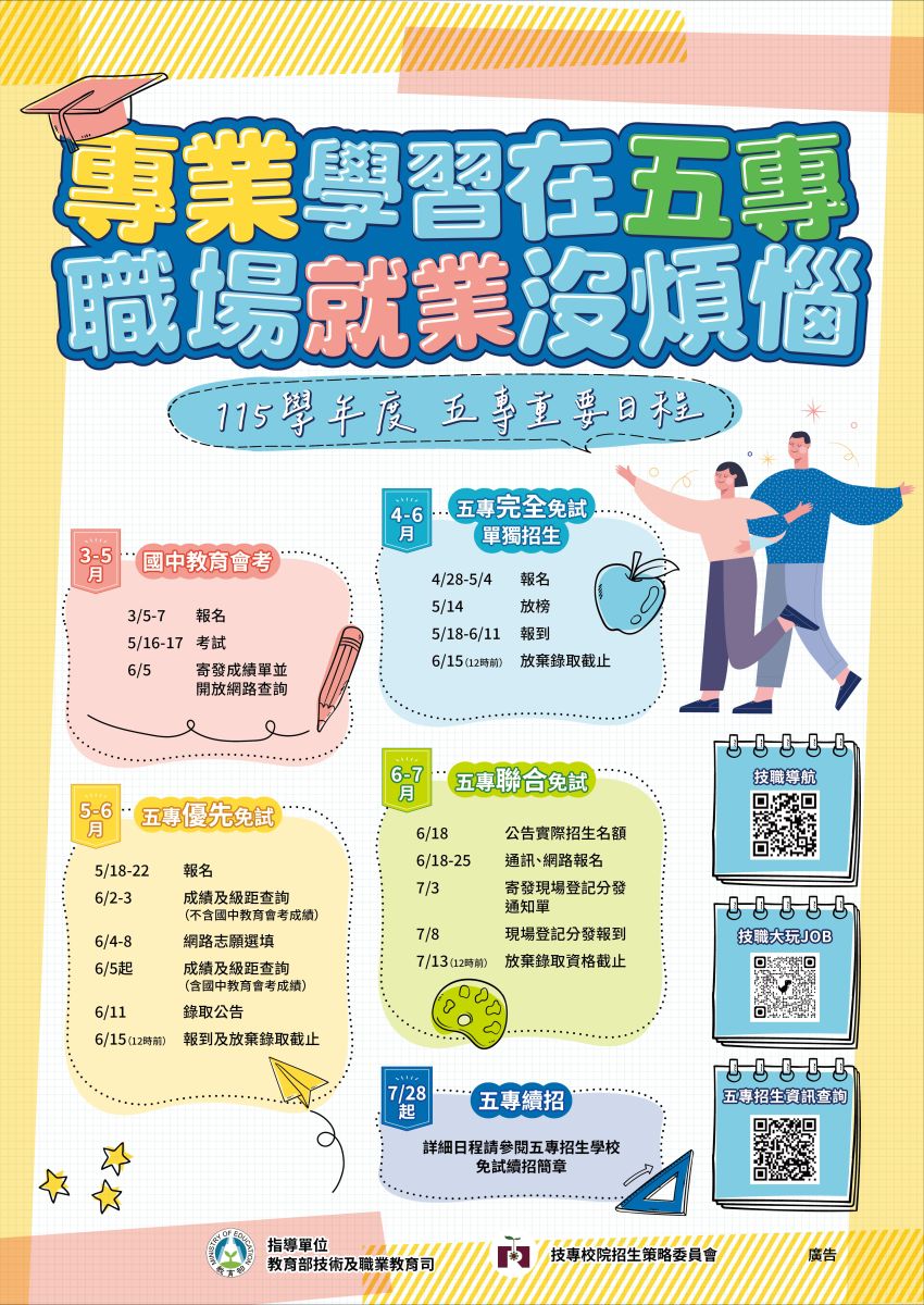 115學年度國中教育會考、五專完全免試入學、五專優先免試入學及北、中、南區五專聯合免試入學之報名、放榜及現場登記分發等重要日程皆業經教育部核定,請由以下附件檔案下載。