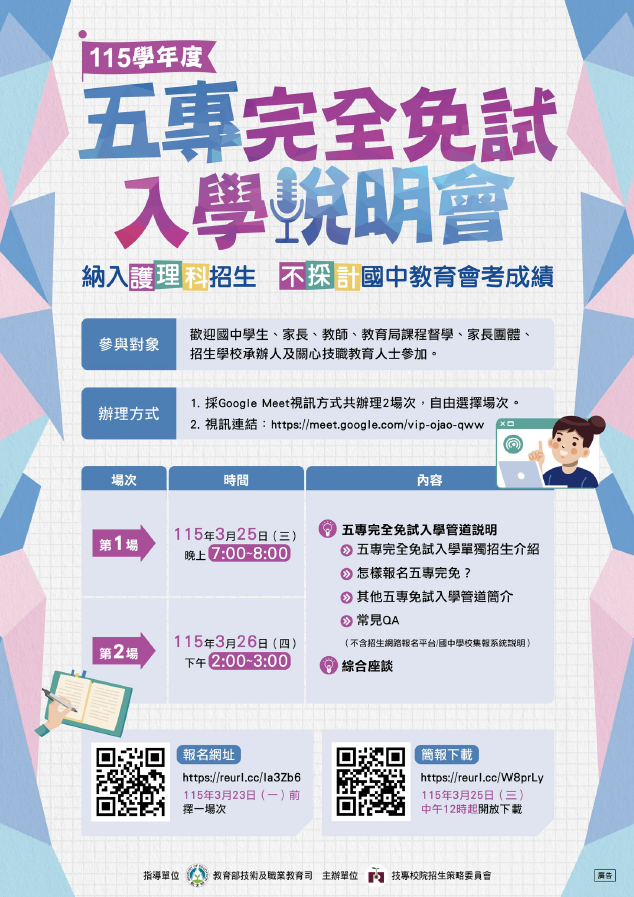 五專完全免試入學由各五專招生學校辦理單獨招生,115學年度起納入護理科招生,並由「技專校院招生委員會聯合會」擔任總召單位,受理集體報名作業與提供諮詢服務。為使大眾能有更多的瞭解,透過舉辦說明會,提供國中學生、家長及教師能孰悉招生期程與招生方式,並進行意見交流。