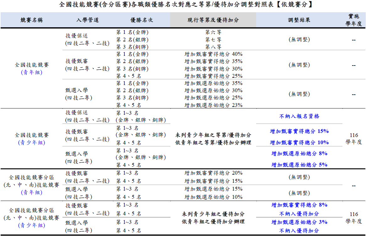 為讓全國技能競賽(含分區賽)「青少年組」獲獎者參加相關入學管道之報名資格優待加分比率與「青年組」有所區隔,規劃於招生簡章增列「青少年組」之報名資格及優待加分,然考量全國技能競賽「青少年組」之競賽難易度及強度係以國中階段之先備能力所設計,且與簡章表列之其他競賽相較下難度較低,故自116學年度起不予納入四技二專、二技技優保送入學管道之報名資格,並於技優甄審入學及甄選入學管道之招生簡章增列全國技能競賽(含分區賽)「青少年組」之報名資格及優待加分: