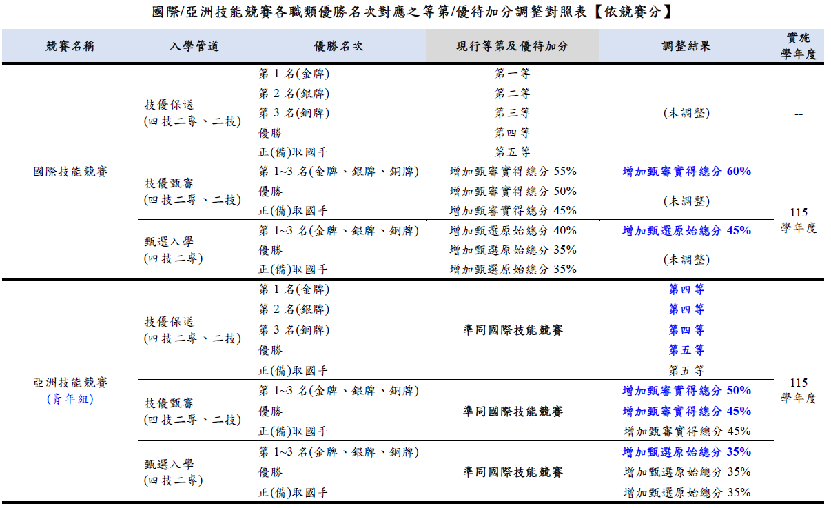 考量亞洲技能競賽之賽程規模、參與國家數、選手數、競賽試題難易度及競爭強度皆不及國際技能競賽,且另為彰顯國際技能競賽(青年組)之重要性及區隔亞洲技能競賽(青年組)之優待加分比率,調增國際技能競賽(青年組)各類優勝名次第1~3名(金牌、銀牌、銅牌)之優待加分比率,故自115學年度起調增國際技能競賽及調整亞洲技能競賽於技優入學及甄選入學之優待加分:
