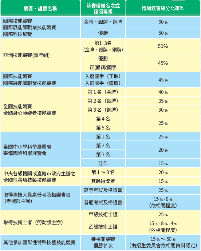 注意事項:國際技能競賽、亞洲技能競賽「青少年組」獲優勝名次者,無法以此資格參加二技技優保送及甄審入學。