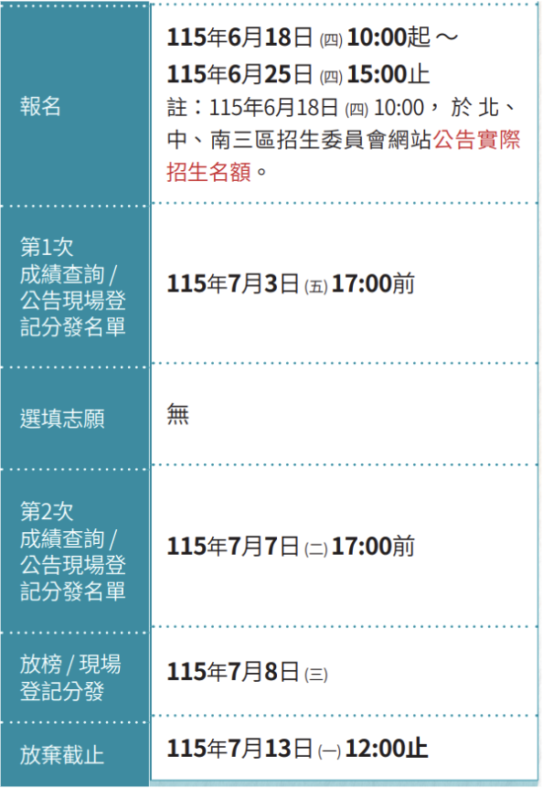 各校錄取方式皆採「現場登記分發報到」辦理,報名學生數未超過所申請學校之科(組)招生名額,則可全額錄取。若超過該校之科(組)招生名額,則依比序項目總積分高低依序分發。若總積分相同者,則依該校所訂之比序項目順序進行比序已排定分發之順序,各項目積分高者優先分發。
