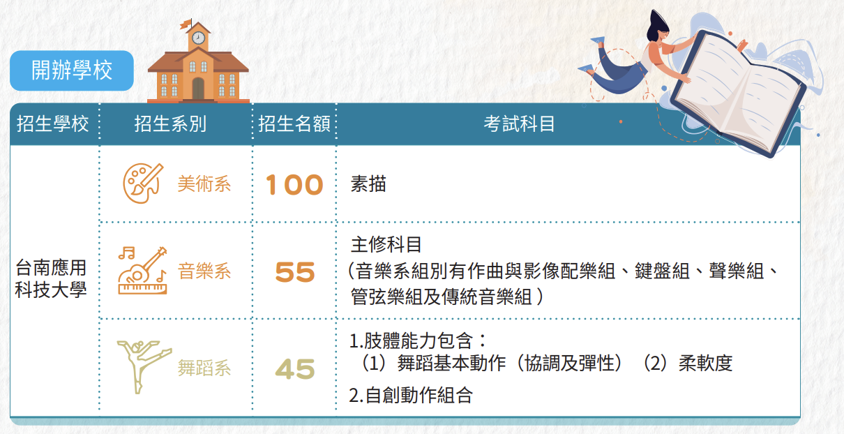 招收對象:對藝術領域有專長或興趣的國中畢業生及具有同等學力資格者。
