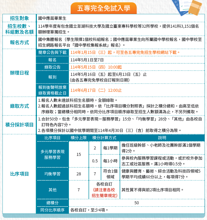 為紓解國中學生升學壓力,使國中學生能夠依自己的興趣性向進而選讀自己心目中的五專學校,113學年度起試辦「五專完全免試入學」,招收國中應屆畢業生,由各五專招生學校辦理單獨招生,學生不受地區限制且完全不採計國中教育會考成績,只要選擇想升讀的1個學校科組志願並由所屬國中學校辦理集體報名,經由五專招生學校錄取,便可在升學路上提早就定位。