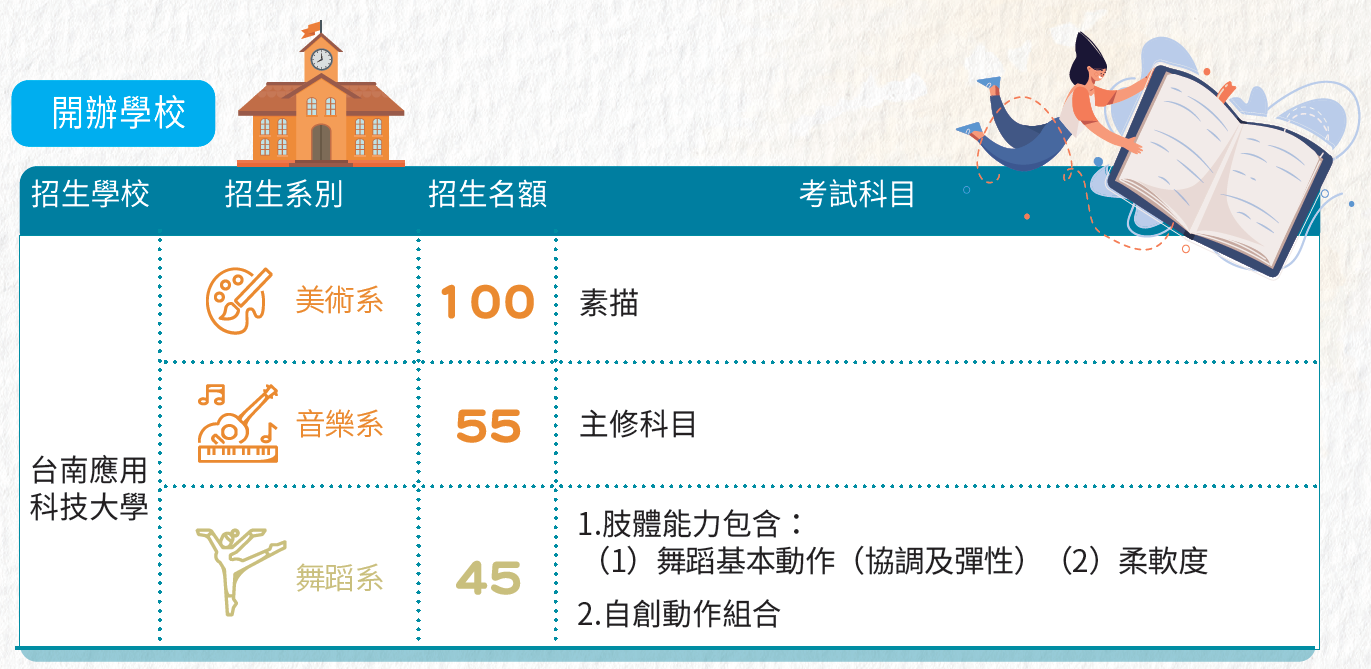 招收對象:對藝術領域有專長或興趣的國中畢業生及具有同等學力資格者。