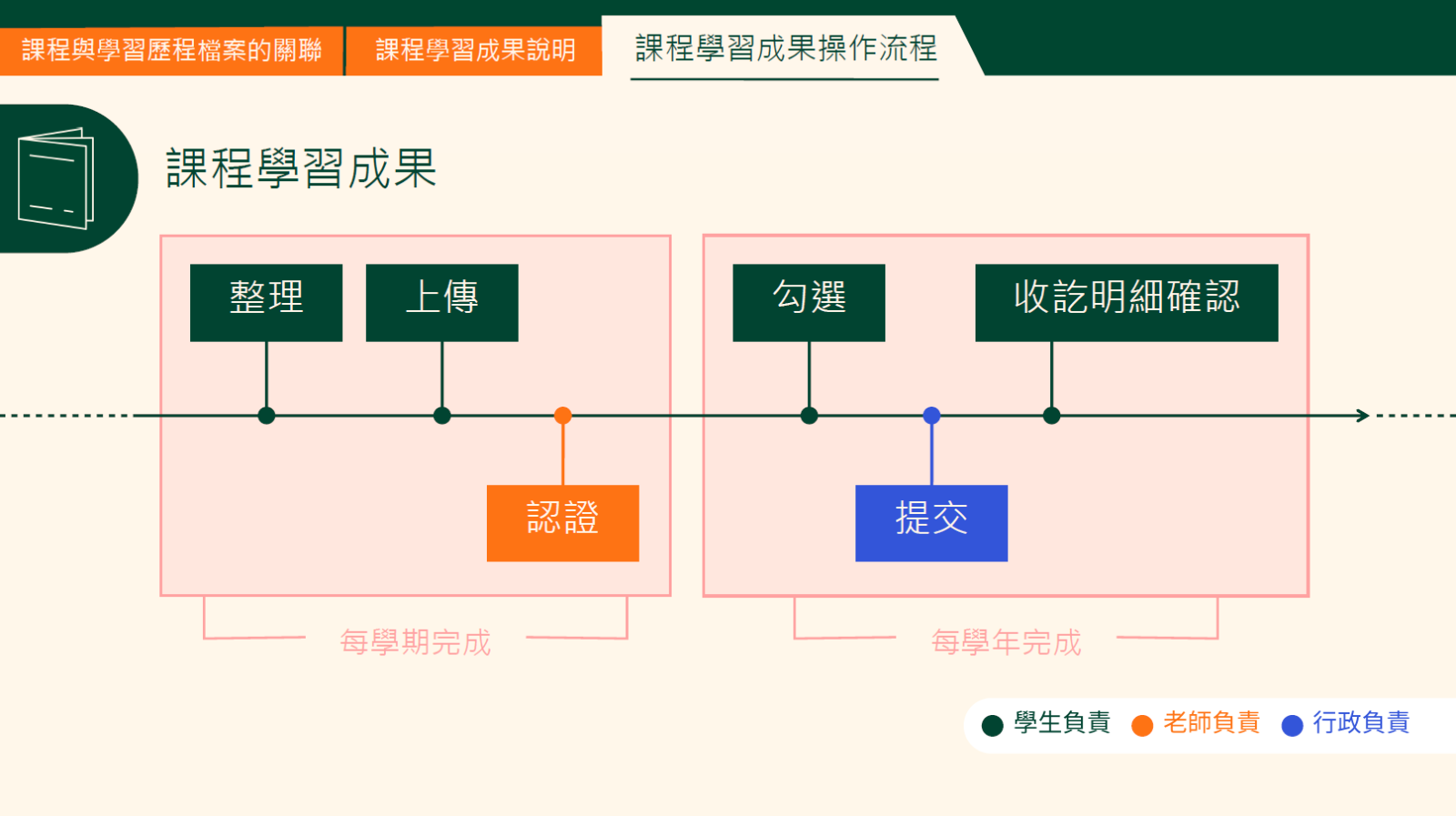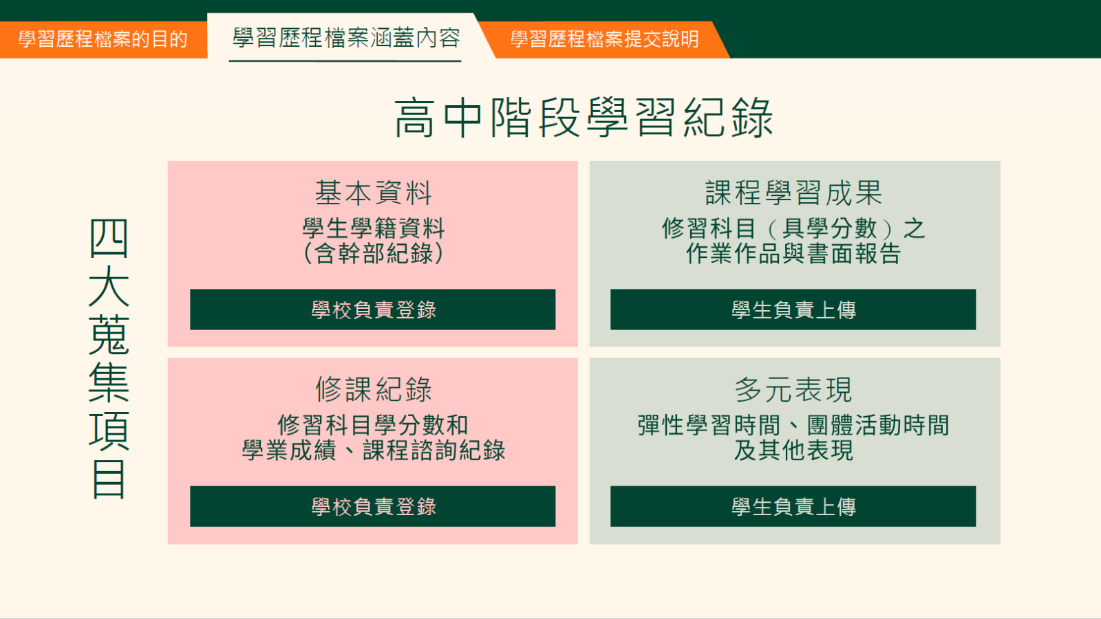 學習歷程檔案分為「基本資料」、「修課紀錄」、「課程學習成果」、「多元表現」四大項目,依照不同項目及權限分別由學校行政人員、學生、教師至學習歷程學校平台進行登錄、上傳及認證,再經由學校將資料提交至教育部學習歷程中央資料庫。