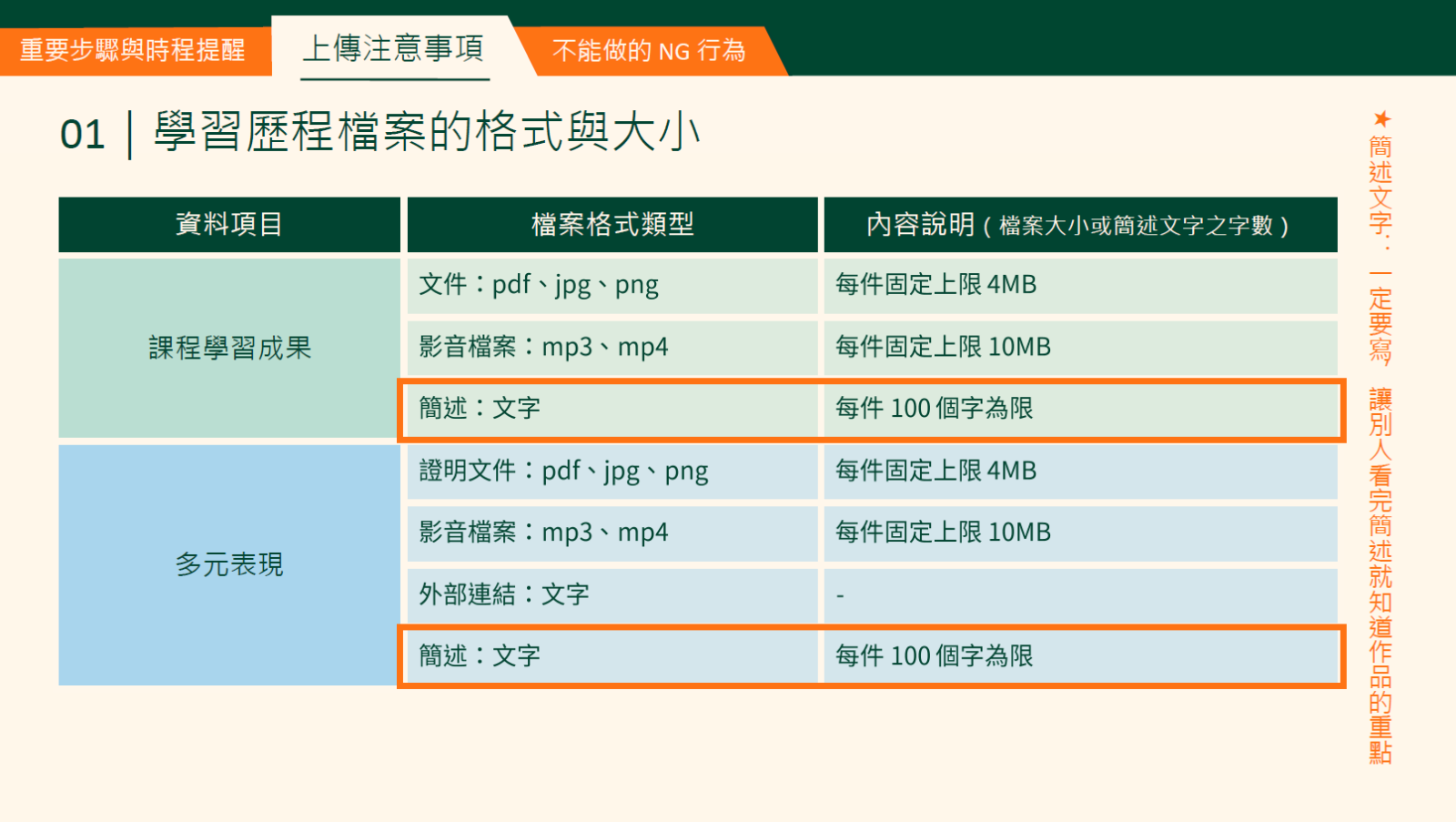 課程學習成果(例如作業、作品、成果報告、專題報告、作品展示、影音創作、圖像設計作品、展演紀錄、實習心得等)以及多元表現(例如競賽成果、檢定證照、社團及幹部經歷、志工服務、職場經歷、彈性學習成果、其他特殊優良表現證明等),均由學生於每學期上傳,呈現方式可為文字、文件、圖片、照片影片等格式。自109學年度起,文件、圖片及影音檔案上傳大小提高上限限制,如下表說明。