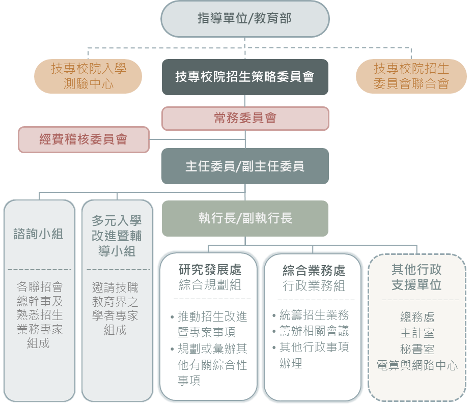 本會設技專校院多元入學改進暨輔導小組,邀請技職教育界之學者專家組成,小組召集人由本會主任委員指定擔任之。