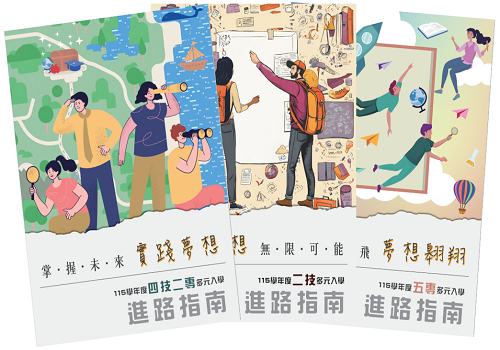 115學年度四技二專、二技、五專多元入學進路指南手冊已開放下載,請至宣導資源專區《文宣資料》下載,歡迎高中職學生、二專或五專學生以及國中學生等有意升學技專校院的同學們下載詳閱,了解各入學管道的特性及重要注意事項。