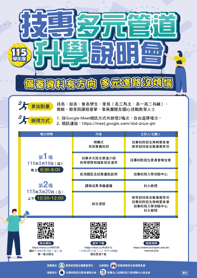 技專入學管道多元,為協助即將升學技專校院之親師生瞭解115學年度四技二專升學資訊,特辦理此說明會。本說明會涵蓋多元入學管道的特性與重要時程、招生參採學習歷程檔案、統一入學測驗之命題範圍、題型說明、試前注意事項及試後公告查詢等內容,另外邀請科大教授分享課程成果準備建議,並與親師生進行意見交流,以期學生思考未來學職涯發展,擇選最合適的升學之道。