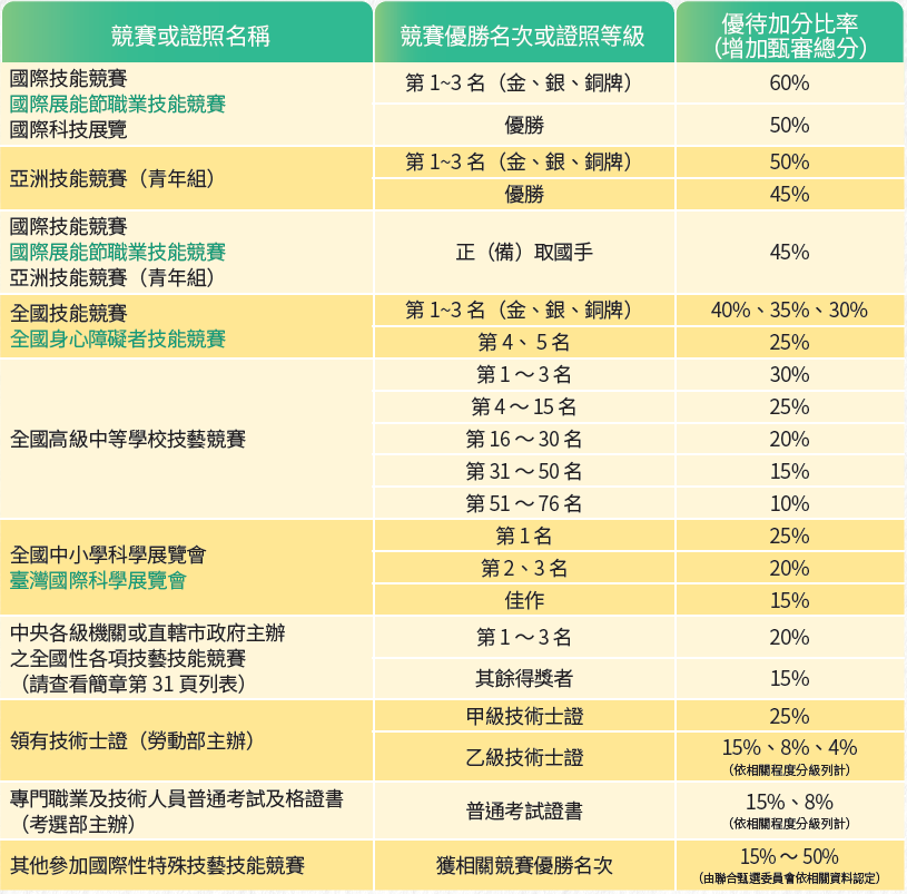 符合簡章所列競賽獲獎、已取得乙級以上技術士證或專技人員普考證書之考生。