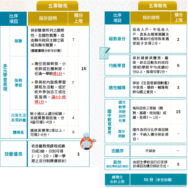 五專聯合免試入學現場登記分發報到作業,依「比序總積分」高低排定報名學生分發順位,比序總積分採計「多元學習表現」、「技藝優良」、「弱勢身分」、「均衡學習」、「適性輔導」、「國中教育會考」以及「其他(招生學校自訂項目)」等7項「主項目」。而其中「多元學習表現」包含「競賽」、「服務學習」、「日常生活表現評量」及「體適能」等4個「分項目」,國中教育會考則採計「國文」、「英語」、「數學」、「自然」及「社會」共5個科目作為「分項目」。各主項目及分項目皆訂有積分採計方式及積分上限,報名學生未加權計算之比序總積分最高分為50分。各招生學校可加權採計部分主項目,至多得擇3項,其加權權重並以1.5為上限。