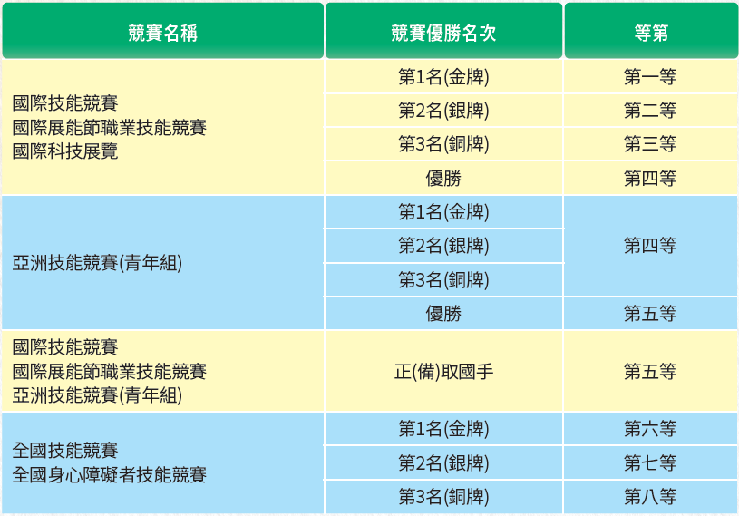 取得國際技能競賽、國際展能節職業技能競賽、國際科技展覽、亞洲技能競賽(青年組)前3名或優勝者。