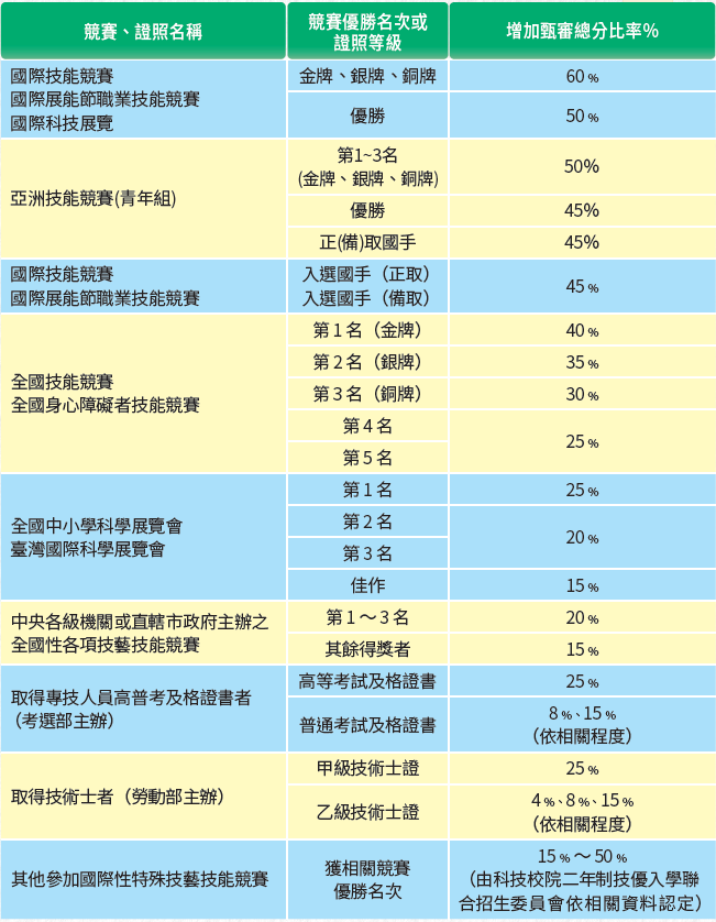 注意事項:國際技能競賽、亞洲技能競賽「青少年組」獲優勝名次者,無法以此資格參加二技技優保送及甄審入學。