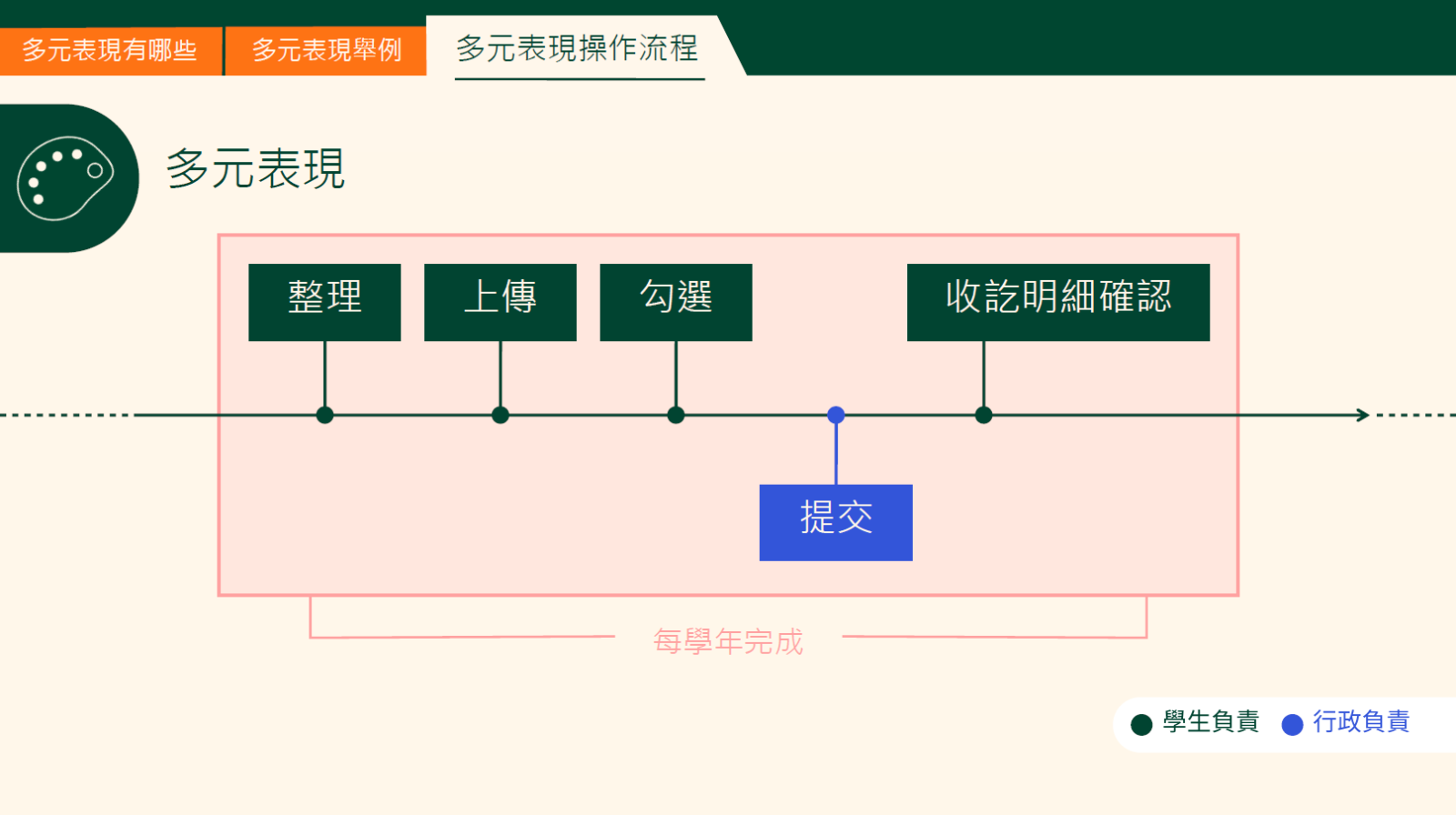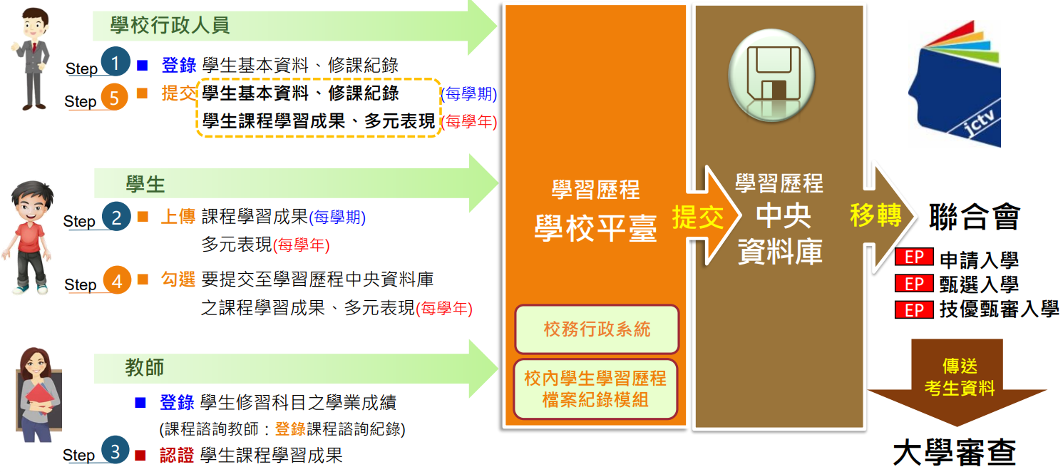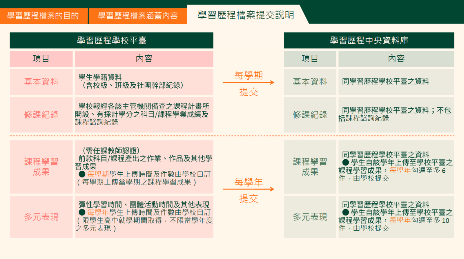 學習歷程檔案分為「基本資料」、「修課紀錄」、「課程學習成果」、「多元表現」四大項目,依照不同項目及權限分別由學校行政人員、學生、教師至學習歷程學校平台進行登錄、上傳及認證,再經由學校將資料提交至教育部學習歷程中央資料庫。