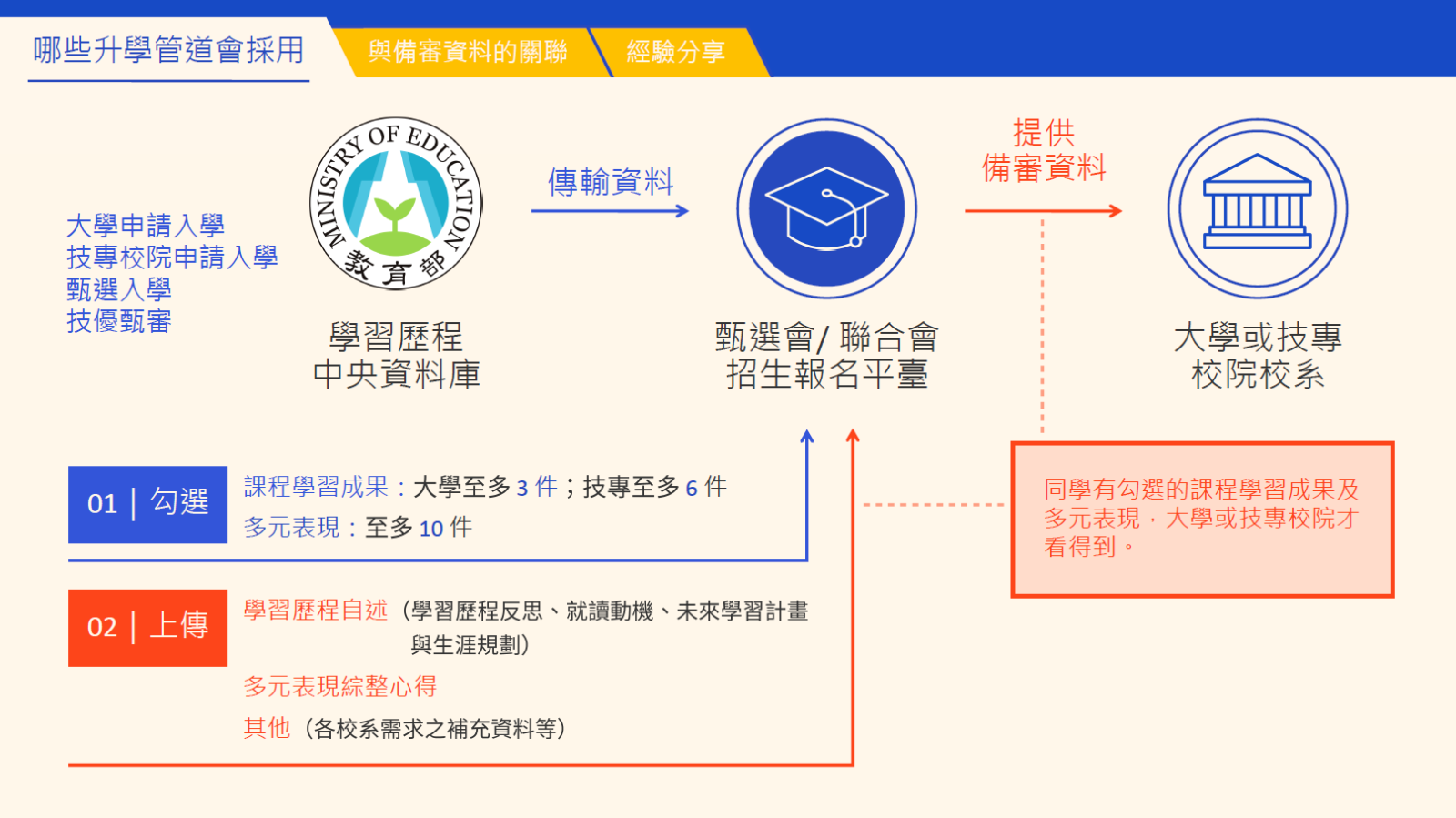 透過學習歷程檔案的建置,學生的修課內容與成績、專題及實作成品、競賽成果、證照、社團及幹部經歷、志工服務及其他各項在學期間的表現都將如實記錄,將成為學生升學的重要依據,於招生階段作為備審資料提供給大專校院,以利各系科更加了解考生的學習表現、個人特質及發展潛力。